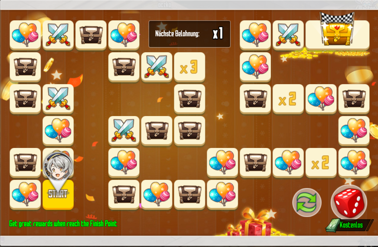 - Ihr könnt einmal am Tag kostenlos würfeln, zusätzliche Würfel gibt es für Coupons / Diamanten.
